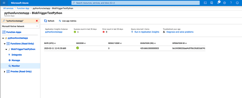 After you uploaded your file, you can open a browser head to the Azure portal, navigate to your Function app and open Functions → BlobTriggerTestPython → Monitor. If you have done everything correctly you will see a successful run (It can take up to 5 minutes to show the run).
