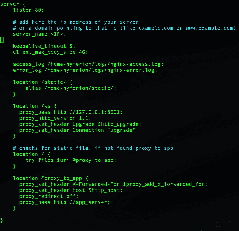 The thing I struggled the most was configuring my NGINX server to redirect Websocket requests to the specific port. Because there is no good documentation out there on how to do this. I was on this for a few hours and was desperate. In the end, it was a pretty easy and straightforward solution, which made it even worse. But hey, sometimes you get stuck on the problem and can't even see the easy solution in front of you. Here's the NGINX conf in case you're interested. The point is that all requests to /ws get directed to the right location.